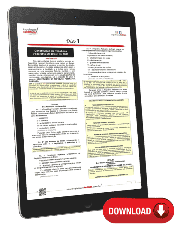 Legislações Facilitadas são versões adaptadas de textos legais que não alteram o significado ou a intenção da lei original, mas adicionam recursos visuais, tais como marcações, destaques, quadros, tabelas, jurisprudências, súmulas, citações doutrinárias e comentários pontuais, para tornar o estudo e a memorização mais simples e agradável.